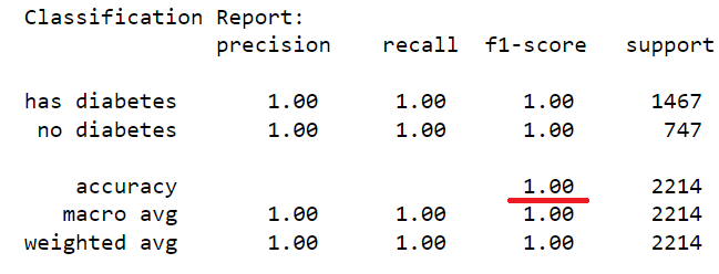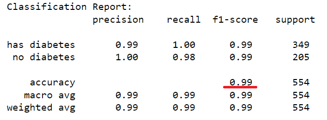 train_report = classification_report(y_train, y_pred_train, target_names=['has diabetes','no diabetes'])